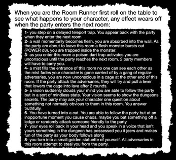- when you’re the room runner you roll to see what happens to your character, usually adding a complication for the rest of the party