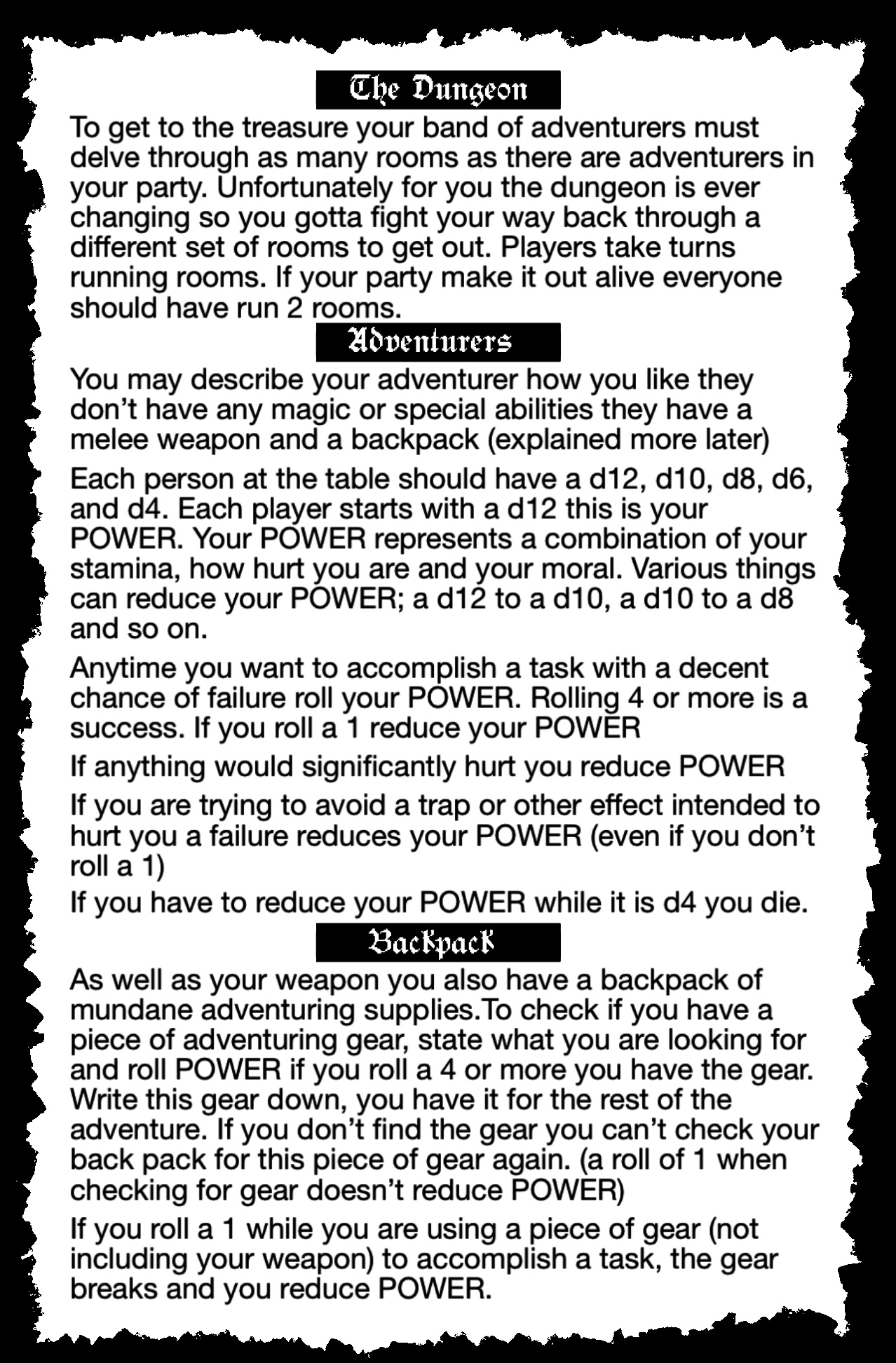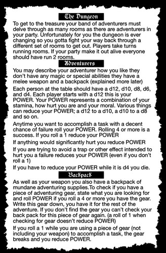 - your die is your POWER, it represents how strong you are, and how close you are to dying your POWER starts as a d12 a roll of 4+ is always a success. Each time you roll a 1 or get hurt you drop your die a size down: d12 becomes a d10, d10 becomes a d8 and so on. This means there is very little to track on a character sheet.