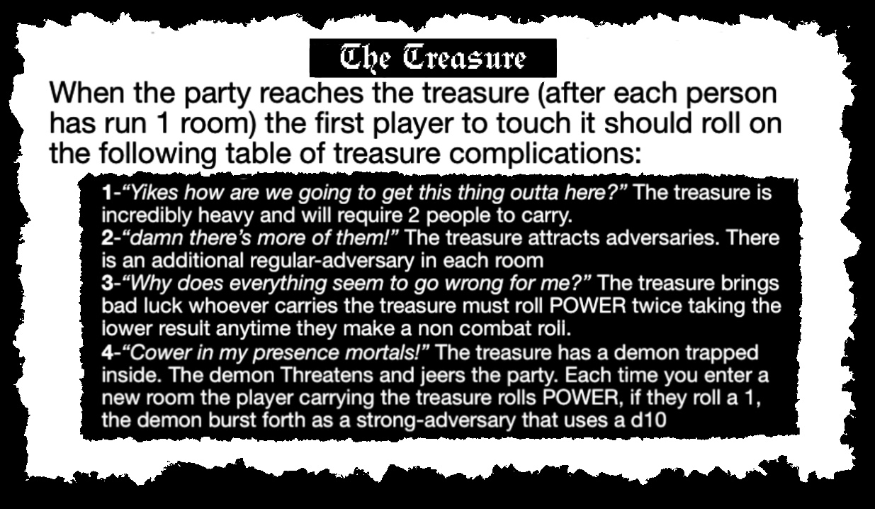 - when you get the treasure you roll on a treasure complications table making it harder to get back out.